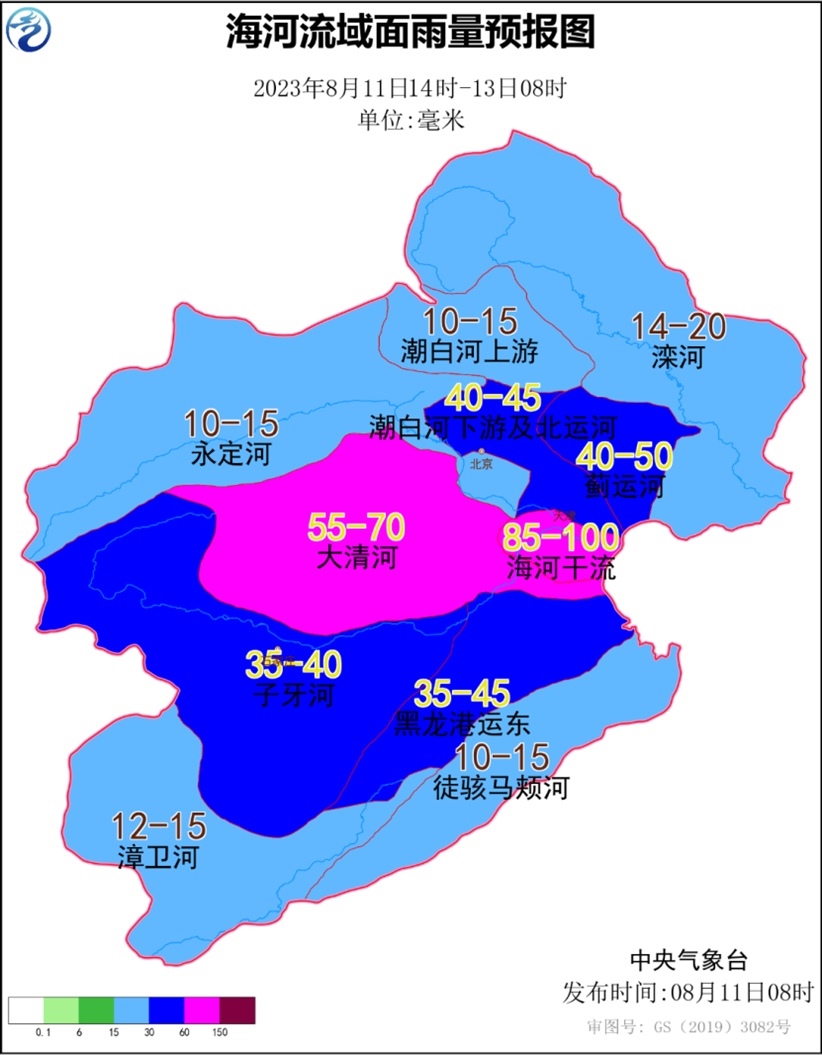 海河流域面雨量預報:11日下午至12日,海河流域中部子流域面雨量35~50毫米,其中大清河面雨量55~70毫米、海河干流85~100毫米。