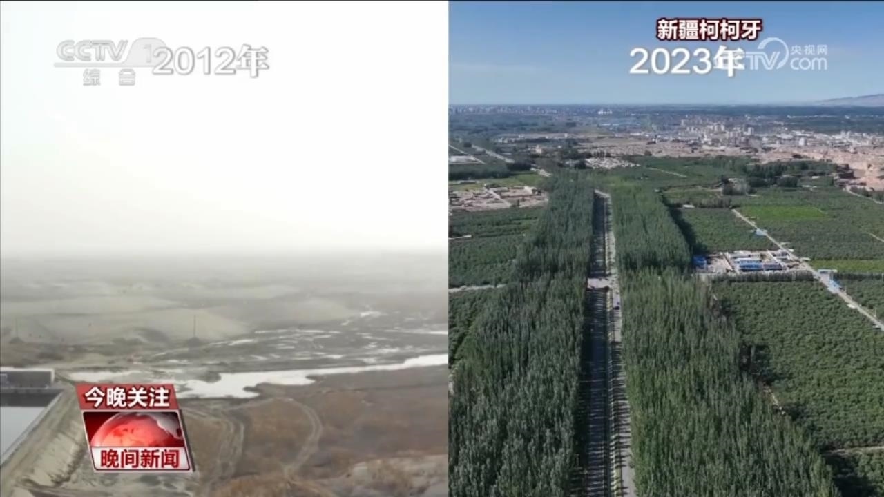 新疆阿克蘇地區(qū)的柯柯牙曾經(jīng)是南疆風(fēng)沙策源地之一。30年來(lái),面對(duì)柯柯牙缺水和土壤鹽堿含量高的情況,當(dāng)?shù)叵到y(tǒng)推進(jìn)山水林田湖草沙一體化保護(hù)和系統(tǒng)治理,柯柯牙綠化工程造林共計(jì)120.26萬(wàn)畝,累計(jì)栽植樹(shù)木1400萬(wàn)株,荒漠變?yōu)榱趾?,最終在貧瘠的戈壁荒漠中,造就了一道“綠色長(zhǎng)城”。