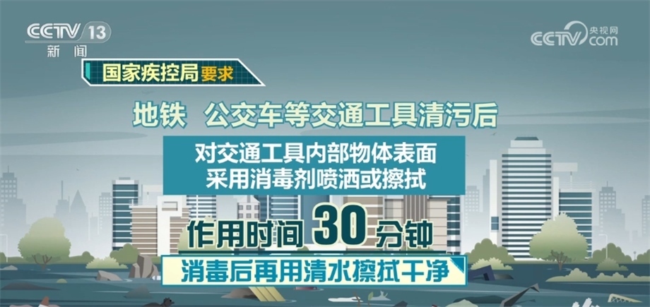 地鐵、公交車等交通工具清污后,對交通工具內(nèi)部物體表面采用消毒劑噴灑或擦拭,作用時間30分鐘,消毒后再用清水擦拭干凈。