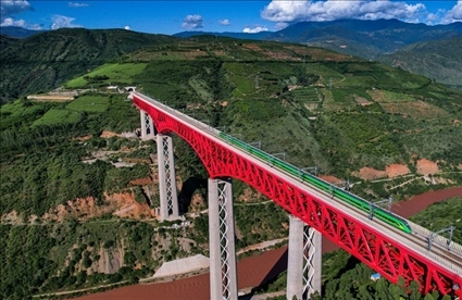 △中老鐵路國(guó)際旅客列車行駛在云南元江特大橋上。