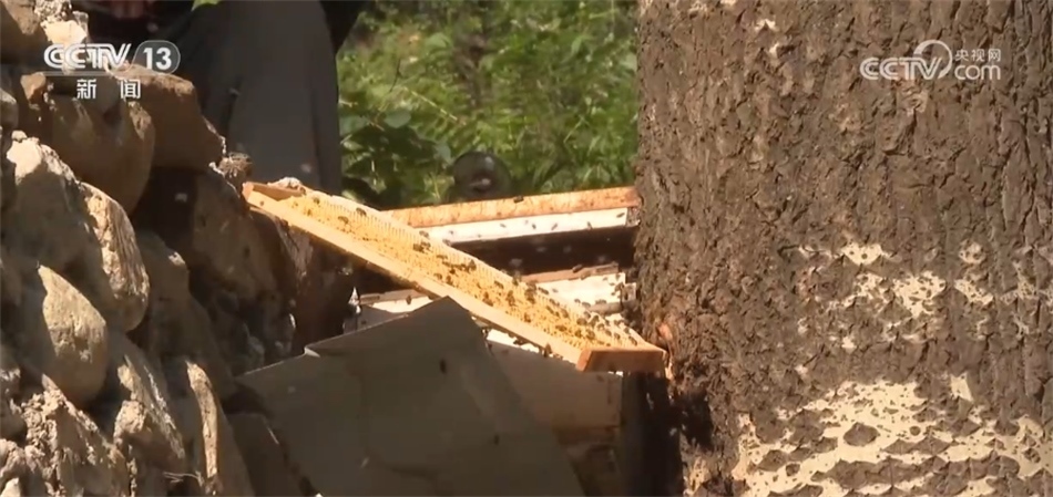 在暴雨災(zāi)害中,泗馬溝村的中華蜂養(yǎng)殖場的一些蜂箱進(jìn)水,蜂王帶著蜂群飛到附近的樹洞里或樹杈上。蜂農(nóng)們用煙熏的方式將蜜蜂從樹洞中熏出來,再用巢脾將它們誘接回養(yǎng)殖蜂箱內(nèi)。目前,絕大部分被暴雨沖散的蜂群已被找回。