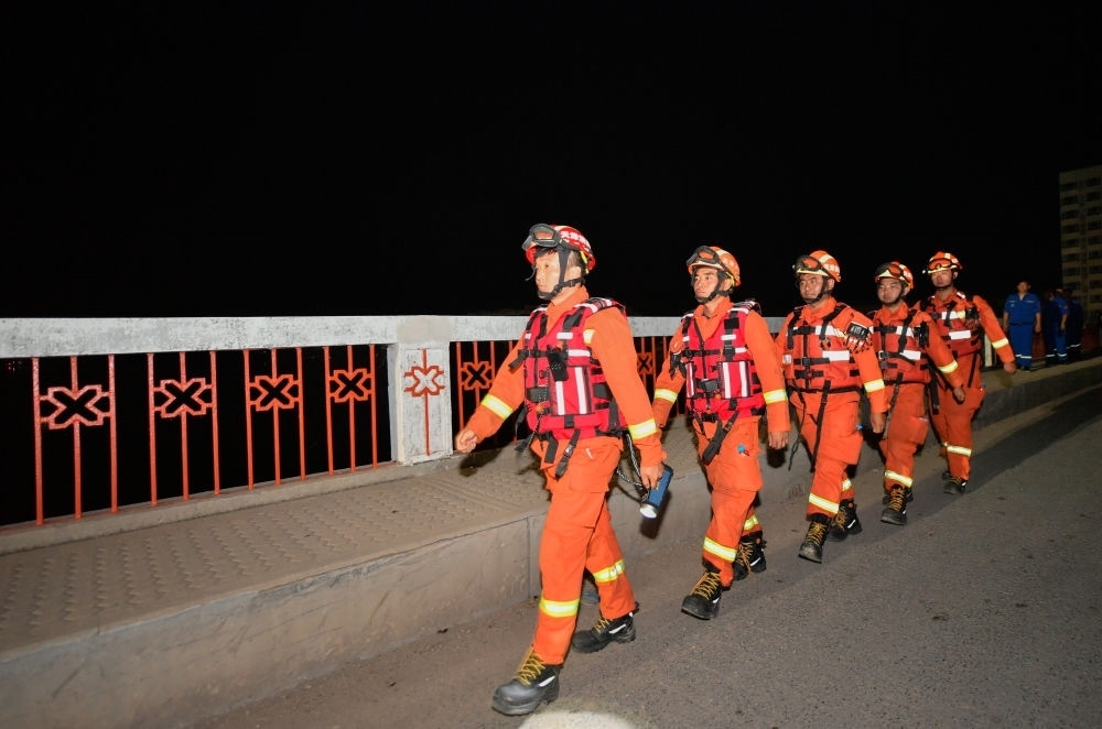 8月9日凌晨,在天津市靜海區(qū)臺頭鎮(zhèn),天津消防救援總隊的消防員巡查經過革命橋。新華每日電訊記者孫凡越攝
