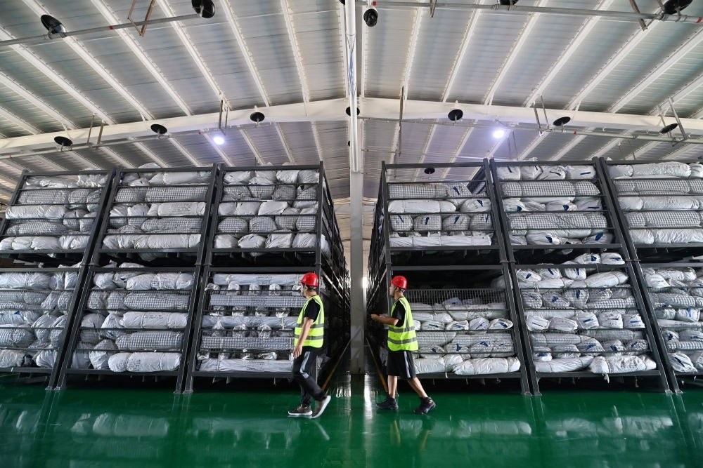 工作人員在天津市救災物資儲備站內的倉庫巡查(8月16日攝)。新華每日電訊記者李然攝