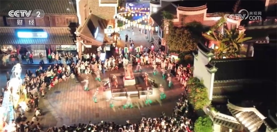總臺記者 姜文婧:大家看我的身邊現(xiàn)在已經(jīng)聚集了很多人,行進式的情景演出《無夢到銅官》已經(jīng)開始了。整場演出都在移步換景中完成,依托古鎮(zhèn)建筑群、街道和各個打卡裝置,營造出漢唐風的市井繁華景象,讓游客身臨其境,還可以與演員互動。