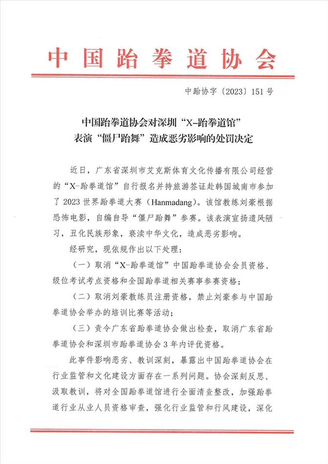 ·在韓表演“僵尸跆舞”跆拳道館被中國跆拳道協(xié)會處罰:取消會員和賽事參賽資格。