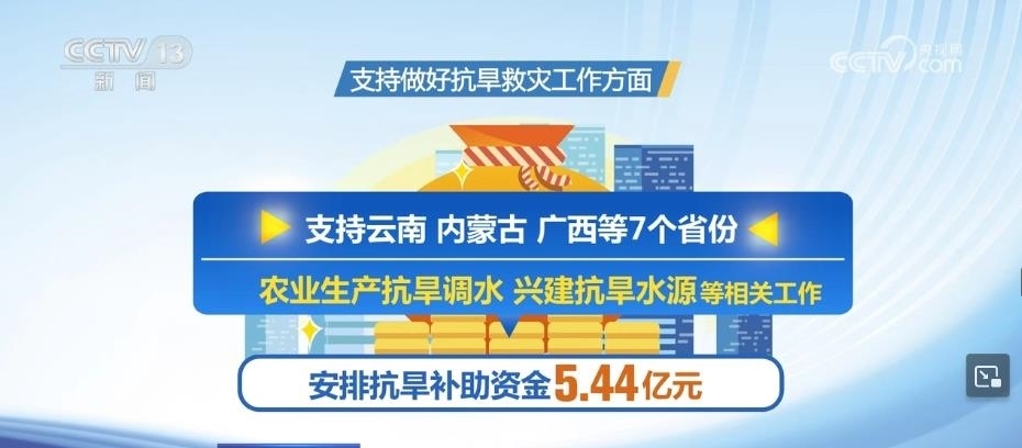 在支持做好抗旱救災(zāi)工作方面,安排抗旱補(bǔ)助資金5.44億元,支持云南、內(nèi)蒙古、廣西等7個(gè)省份,開展農(nóng)業(yè)生產(chǎn)抗旱調(diào)水、興建抗旱水源等相關(guān)工作。 ?