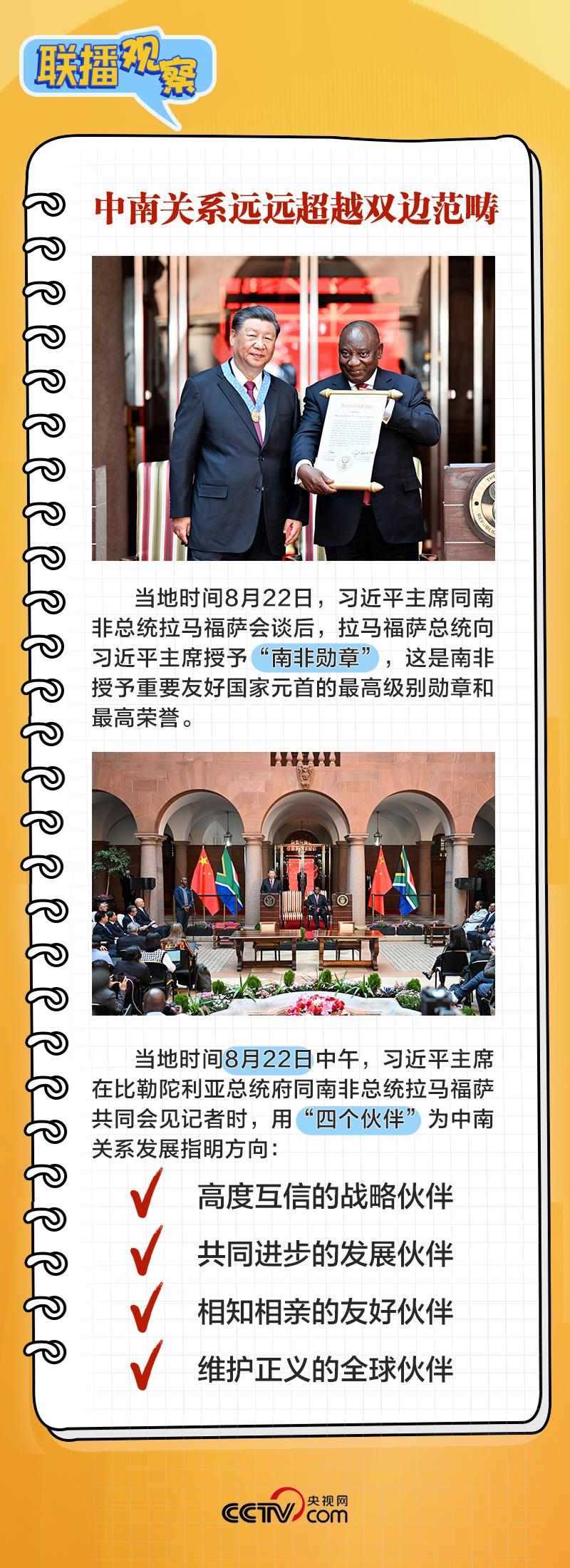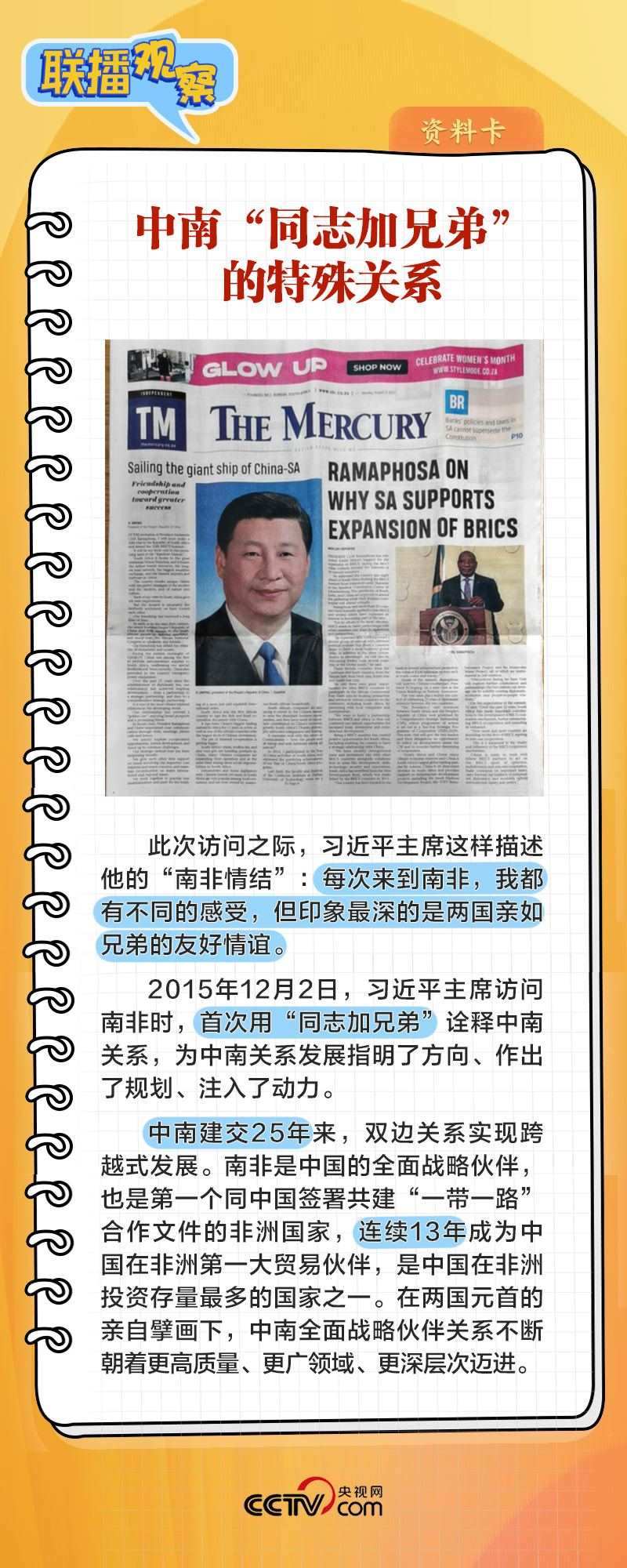 8月22日上午,在同南非總統(tǒng)拉馬福薩舉行會談時,習主席表示:“中南關(guān)系之所以好、中南友誼之所以深,關(guān)鍵在于兩國兩黨在各自發(fā)展道路上休戚與共,結(jié)下了同志加兄弟的深厚友誼?!?/p>