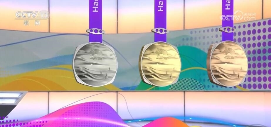 杭州亞運會獎牌名為“湖山”?!昂健睂⒘间疚幕姆叫斡耒蛨A形的獎?wù)氯跒橐惑w,正面用凸出的線條勾勒出“三面云山一面城”的杭城畫卷,湖水漣漪,山巒起伏。獎牌上方的束扣是一個帶有倒影的三孔橋,設(shè)計取自京杭大運河最南端的拱宸橋。一塊獎牌,將杭州的三處世界文化遺產(chǎn):良渚、西湖、大運河都融入其中。