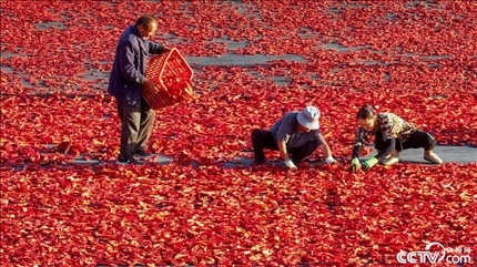 新疆巴音郭楞,博湖縣迎來(lái)辣椒豐收季,農(nóng)民們搶抓晴好天氣采摘、晾曬辣椒。