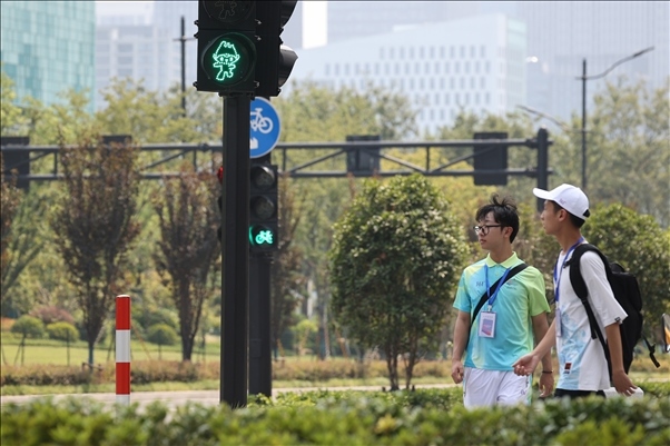 2023年8月25日,杭州亞運(yùn)村內(nèi),亞運(yùn)吉祥物版的交通信號(hào)燈出現(xiàn)在路口。