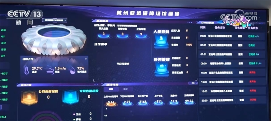 亞運(yùn)會(huì)場(chǎng)在技術(shù)創(chuàng)新上,會(huì)場(chǎng)可以滿(mǎn)足賽事期間數(shù)萬(wàn)人同時(shí)使用4G、5G網(wǎng)絡(luò)收發(fā)視頻、圖片、撥打電話(huà)。當(dāng)局部用戶(hù)使用網(wǎng)絡(luò)數(shù)據(jù)上升的時(shí)候,場(chǎng)館內(nèi)的感知探針等設(shè)備會(huì)模擬和實(shí)時(shí)反饋上傳數(shù)據(jù),指揮中心屏幕上可以通過(guò)數(shù)據(jù)和紅橙黃綠四種顏色來(lái)判斷網(wǎng)速。工作人員能先于用戶(hù),提前感知到網(wǎng)速變化并及時(shí)調(diào)度解決。