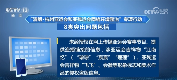 未經(jīng)授權(quán)在網(wǎng)上傳播亞運會賽事節(jié)目、提供盜播鏈接的信息;涉亞運會吉祥物“江南憶”(“琮琮”“宸宸”“蓮蓮”)、亞殘運會吉祥物“飛飛”、會徽等形象標志和美術(shù)作品的侵權(quán)盜版信息。