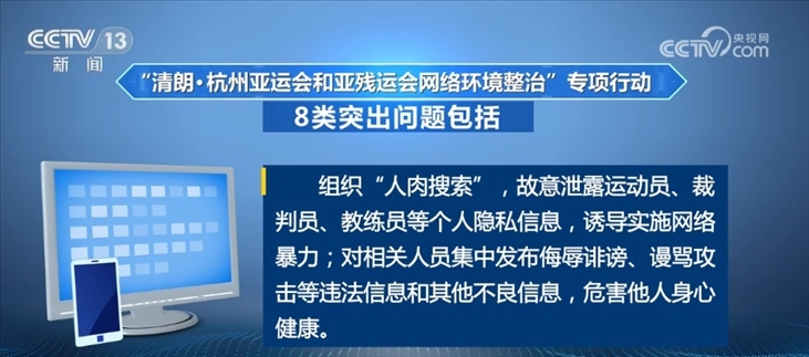 央視網(wǎng)消息:記者昨天(8月28日)從中央網(wǎng)信辦獲悉,為做好杭州亞運會和亞殘運會保障工作,決定自8月28日至10月29日開展“清朗·杭州亞運會和亞殘運會網(wǎng)絡(luò)環(huán)境整治”專項行動。專項行動將圍繞賽事舉辦,集中整治散布虛假信息、片面、歪曲傳播突發(fā)事件信息等8類突出問題。