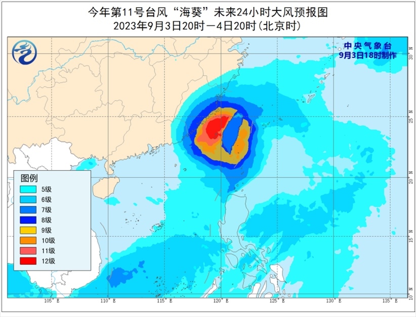 大風預報:9月3日20時至4日20時,巴士海峽、臺灣海峽、臺灣以東洋面、東海南部及釣魚島附近海域、南海東北部以及浙江南部沿海、福建沿海、廣東東部偏東地區(qū)沿海、臺灣島及沿海將有6-8級、陣風9-10級大風,部分海域或地區(qū)的風力有9-12級,陣風13-14級,“??敝行慕?jīng)過的附近海面或地區(qū)的風力有13-14級,陣風15級。