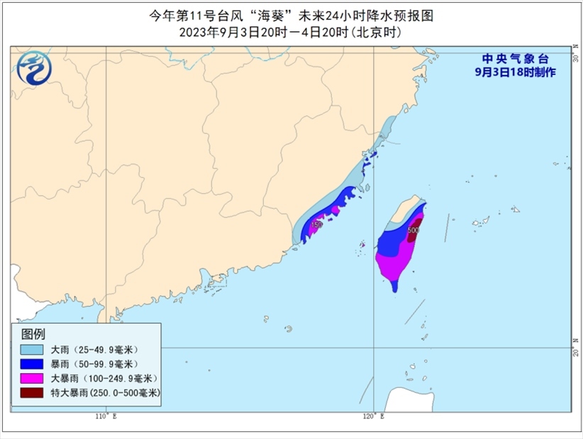 降水預報:9月3日20時至4日20時,福建東部、浙江東南部沿海、臺灣島等地有大到暴雨,其中,福建東南部沿海、臺灣島東部和南部等地部分地區(qū)有大暴雨,臺灣島東部局地特大暴雨(250~500毫米);上述地區(qū)最大小時降雨量20~50毫米,局地可超過60毫米,局地還有雷暴大風等強對流天氣。