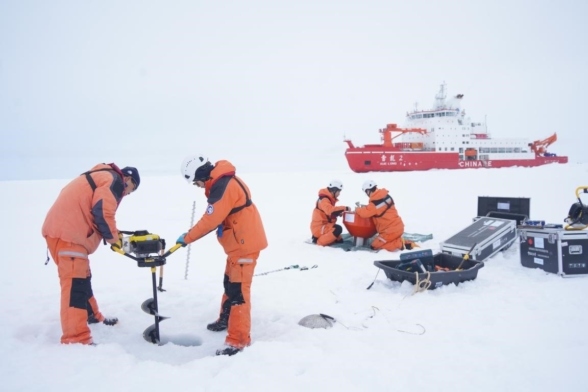 中國第13次北冰洋科學(xué)考察隊(duì)在北極點(diǎn)附近開展海冰綜合作業(yè)