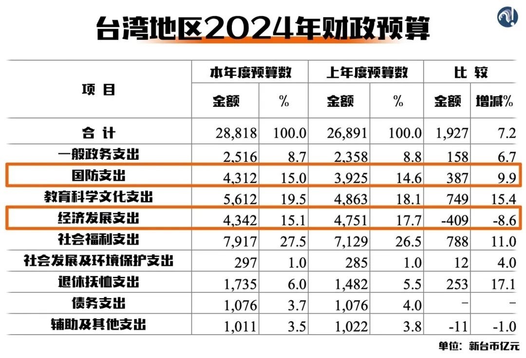 民進黨當局不久前通過的2024年財政預(yù)算案就很能說明問題。各項支出中,防務(wù)支出繼續(xù)保持增長,經(jīng)濟發(fā)展支出卻是所有領(lǐng)域中跌幅最大的。