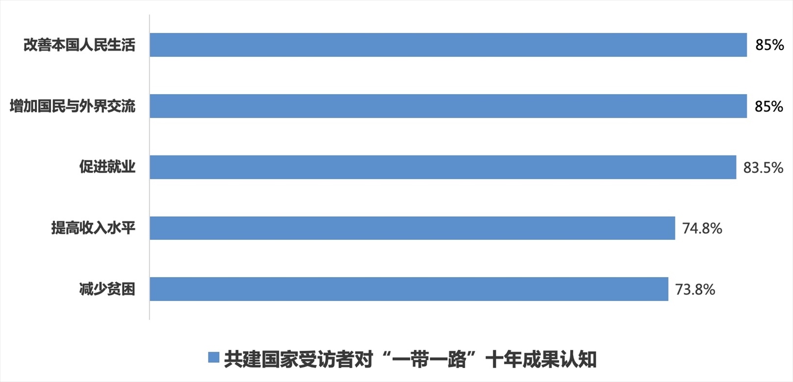 “一帶一路”倡議下一個個“惠而實”的民生工程、民心工程,為各國人民帶來實實在在的獲得感、幸福感和安全感,85%的共建國家受訪者認(rèn)為“一帶一路”切實改善了本國人民的生活;85%的共建國家受訪者認(rèn)為通過“一帶一路”民眾獲得了更多與外界交流互鑒的機會;分別有83.5%、74.8%和73.8%的共建國家受訪者認(rèn)可共建“一帶一路”在促進就業(yè)、提高居民收入水平和減少貧困方面的作用;86.5%的共建國家受訪者認(rèn)為“一帶一路”倡議和“以人民為中心”的理念高度契合,惠及全球民眾的愿景正在逐步變?yōu)楝F(xiàn)實。