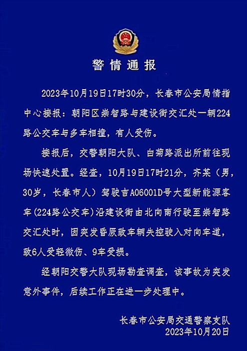 ·長春交警通報公交車與多車相撞:30歲司機突發(fā)昏厥致車輛失控,6人輕微傷。