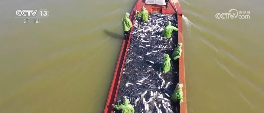 據(jù)了解,大明湖水域面積達(dá)到12.8萬(wàn)畝,是江西第二大的內(nèi)陸湖泊,十分適合發(fā)展水產(chǎn)養(yǎng)殖。養(yǎng)殖的品種以青魚(yú)、草魚(yú)、鰱魚(yú)、鳙魚(yú)“四大家魚(yú)”為主。秋捕開(kāi)始時(shí),漁業(yè)工人用特制的漁網(wǎng)將魚(yú)兒驅(qū)趕到特制的長(zhǎng)條通道里,再逐步收起漁網(wǎng),工人們?cè)诹硪欢俗屑?xì)挑選活魚(yú)的品種和大小,體型不達(dá)標(biāo)的魚(yú)會(huì)被挑出來(lái),放回湖中繼續(xù)養(yǎng)。據(jù)現(xiàn)場(chǎng)工人介紹,2023年因?yàn)轱L(fēng)調(diào)雨順,大明湖迎來(lái)一個(gè)豐收年,捕獲上來(lái)的活魚(yú)一般都在4斤以上,全年總產(chǎn)量預(yù)計(jì)超過(guò)200萬(wàn)公斤。