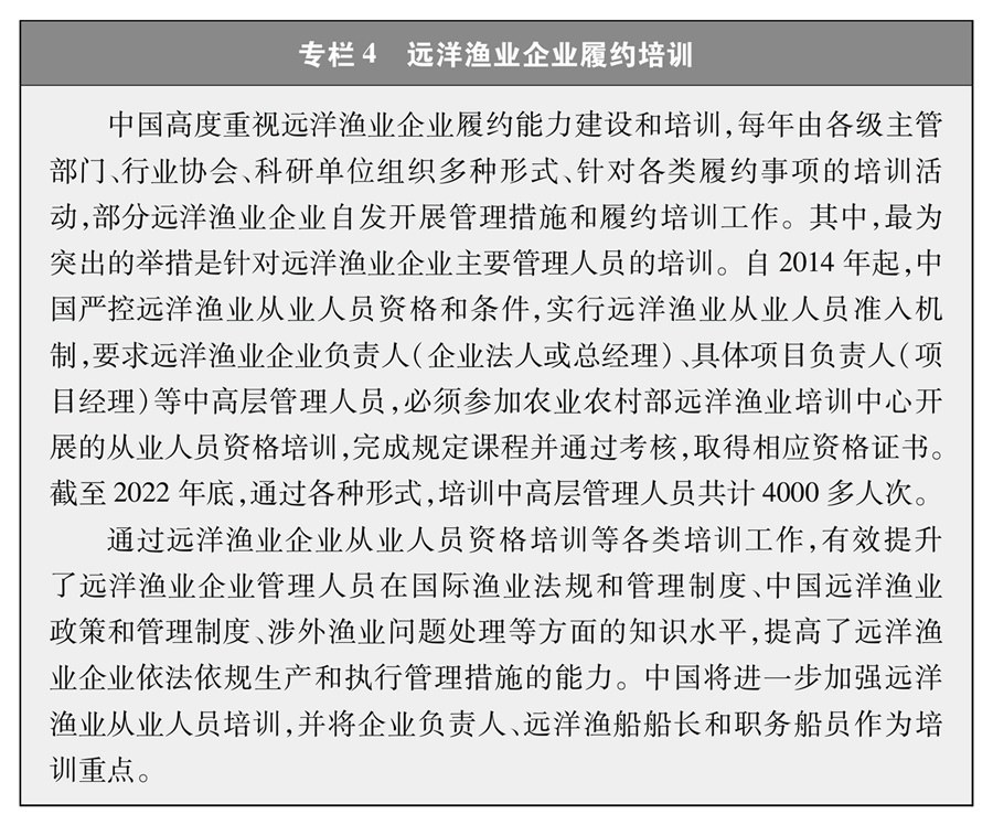 中國(guó)遠(yuǎn)洋漁業(yè)管理堅(jiān)持以科學(xué)為基礎(chǔ),建立并完善由主管部門(mén)、行業(yè)協(xié)會(huì)、科研單位通力合作的管理和履約科技支撐體系,共同制定漁業(yè)管理策略、實(shí)施管理措施并對(duì)實(shí)施效果進(jìn)行評(píng)價(jià)。充分發(fā)揮行業(yè)協(xié)會(huì)在組織協(xié)調(diào)漁業(yè)生產(chǎn)、規(guī)范企業(yè)行為、組織從業(yè)人員培訓(xùn)、加強(qiáng)行業(yè)自律、推廣示范應(yīng)用等方面的作用,成立遠(yuǎn)洋漁業(yè)履約研究中心、遠(yuǎn)洋漁業(yè)數(shù)據(jù)中心,完善履約工作機(jī)制,加強(qiáng)相關(guān)科研機(jī)構(gòu)和智庫(kù)建設(shè),逐步提高履約能力和成效。