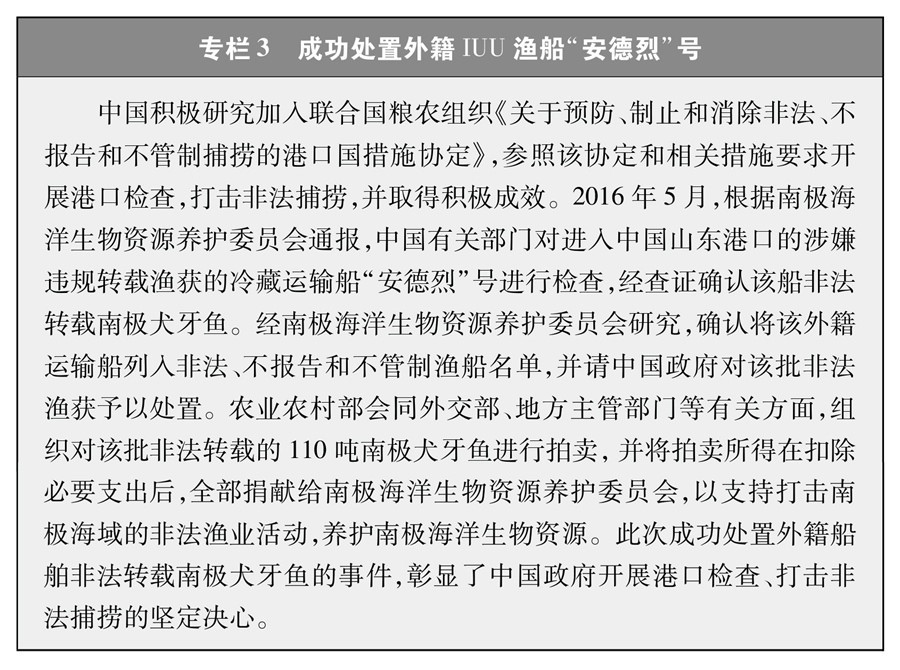 堅(jiān)決支持并積極配合國(guó)際社會(huì)打擊各種非法漁業(yè)活動(dòng)。2020年起,中國(guó)每年派遣執(zhí)法船赴北太平洋公海開(kāi)展?jié)O業(yè)執(zhí)法巡航,查處違規(guī)作業(yè)行為。2016年,配合南極海洋生物資源養(yǎng)護(hù)委員會(huì)成功扣押處置了一艘外籍漁船非法轉(zhuǎn)載南極犬牙魚(yú)案件。2018年起,將中國(guó)加入的相關(guān)區(qū)域漁業(yè)管理組織公布的非法、不報(bào)告和不管制漁船名單通報(bào)國(guó)內(nèi)各港口,拒絕此類漁船進(jìn)港以及卸貨、補(bǔ)給、加油等活動(dòng)。