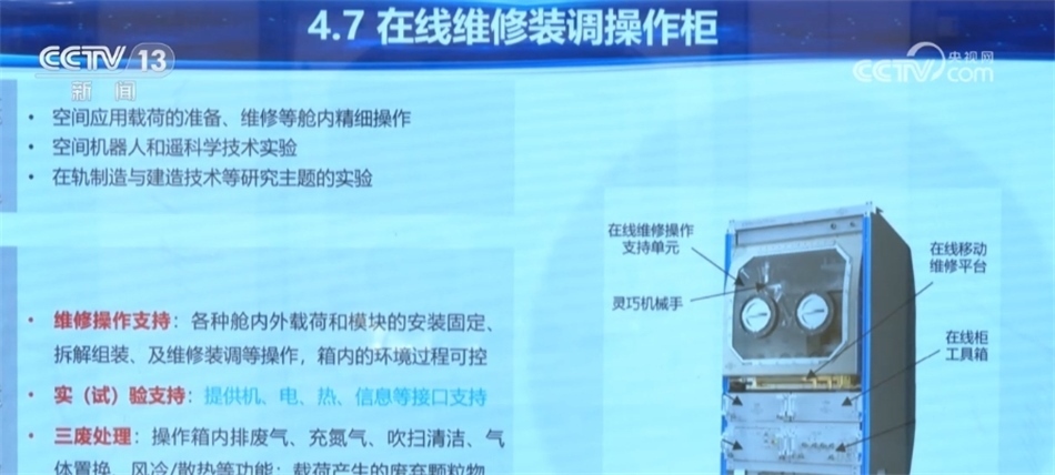 中國科學院空間應用工程與技術中心研究員 張璐:其他的(實驗柜)都屬于科學實驗柜,都會有一個或者多個比較固定的研究主題。這個實驗柜實際上更多的是一個支撐類的實驗柜,它并沒有一個比如說像生命科學、流體科學這方面的專一的、獨立的一個研究方向。以前的時候,有些(設備)比如說壞了,航天員不是很方便地去進行在軌的一些維修和更換。這個在線實際上就是指在軌的狀態(tài)下,航天員可以對其他的科學實驗柜,包括其他的空間應用系統(tǒng)的一些載荷裝置更換、維修,或者有操作需求的時候,這個實驗柜提供了一系列包括結構安裝、潔凈空間的處理,包括還有機械臂(手)的輔助操作,相應的一些真空、排廢氣,很多工具類的支撐,來保障這些維修操作能夠在軌順利展開。