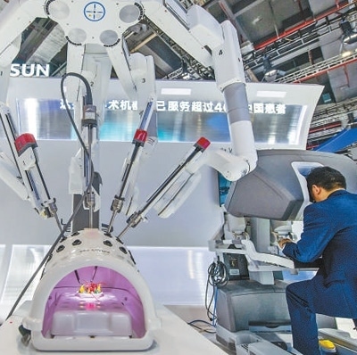 在醫(yī)療器械及醫(yī)藥保健展區(qū),參觀者正在體驗操作復(fù)星醫(yī)藥首臺國產(chǎn)“達芬奇Xi手術(shù)系統(tǒng)”。人民網(wǎng)記者 翁奇羽攝