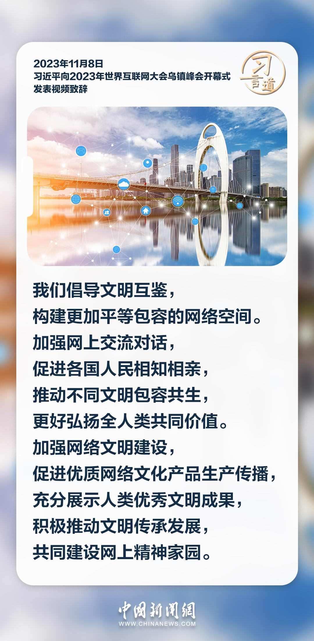 11月8日上午,國家主席習(xí)近平向2023年世界互聯(lián)網(wǎng)大會(huì)烏鎮(zhèn)峰會(huì)開幕式發(fā)表視頻致辭。習(xí)近平指出——