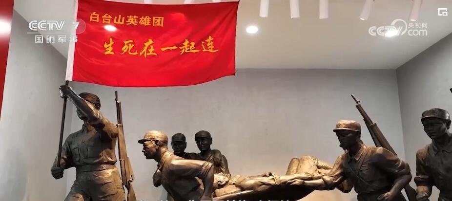 軍事記者 張喬普:在這個(gè)旅的旅史長廊,在我身旁的這些櫥窗,我看到了包括“生死在一起”連在內(nèi)的,一共17個(gè)英模單位的旗幟。這一面面鮮紅的戰(zhàn)旗,見證、記錄了這個(gè)旅代代官兵一路從抗日戰(zhàn)爭時(shí)期到抗美援朝浴血奮戰(zhàn)、英勇無畏的戰(zhàn)斗足跡。其中最引人注目的就是我身旁的這面“白臺(tái)山英雄團(tuán)”的戰(zhàn)旗。這面戰(zhàn)旗曾參加國慶70周年閱兵,在天安門廣場接受黨和人民的檢閱。而她的精神內(nèi)核,就是“生死在一起”。