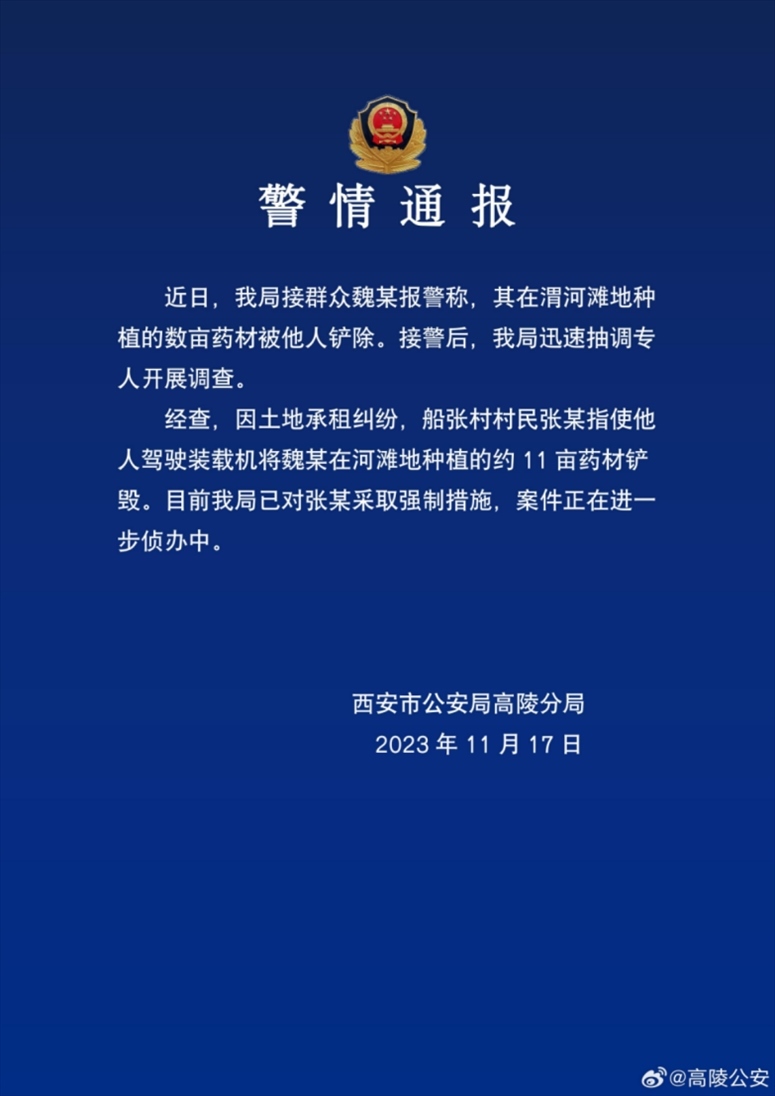 ·西安警方通報“十多畝藥材被鏟毀”:已對指使者采取強(qiáng)制措施。