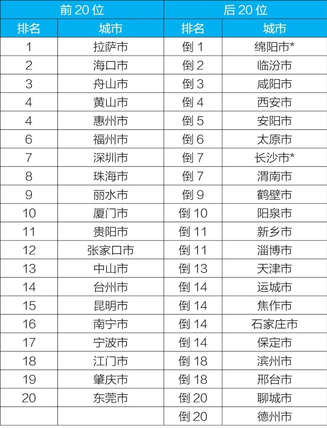 1—10月,168個重點城市中,空氣質(zhì)量排名前20位城市依次是拉薩、??诤椭凵降瘸鞘校◤牡?名至第20名);空氣質(zhì)量排名后20位城市依次是綿陽、臨汾和咸陽等城市(從倒數(shù)第1名至并列倒數(shù)第20名)。其中,綿陽市科技城新區(qū)的高新區(qū)自來水公司站點4月和5月、長沙市開福區(qū)的伍家?guī)X站點6月受到嚴(yán)重人為干擾,對所在城市當(dāng)月六項污染物濃度進行了最大值替代處理。見附表2。