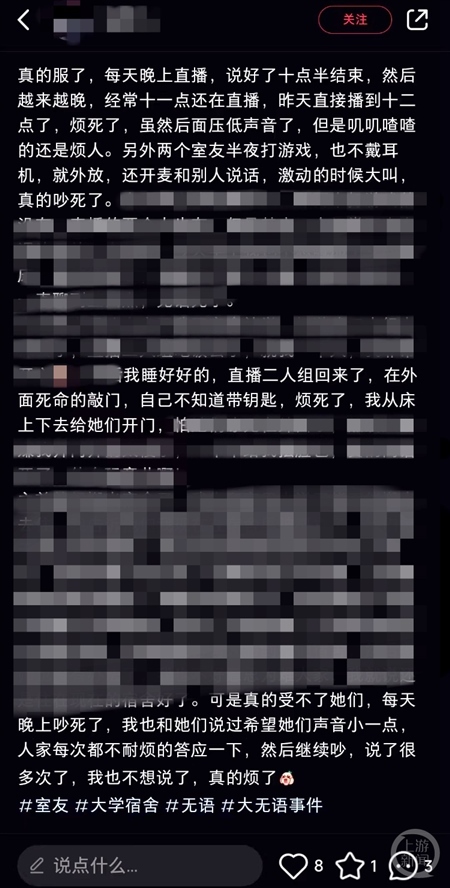 在某社交平臺搜索“室友在宿舍直播”,上游新聞記者發(fā)現(xiàn)超過50篇筆記都是有關(guān)大學(xué)生寢室直播引發(fā)室友不滿:“每天晚上吵死了,我也和她們說過希望她們聲音小一點,人家每次都不耐煩地答應(yīng)一下,然后繼續(xù)吵”“我覺得在寢室直播就是不合適啊,但是想不到什么嚴(yán)肅有效的理由讓她不直播,求大家?guī)兔Τ鲋\劃策一下”……