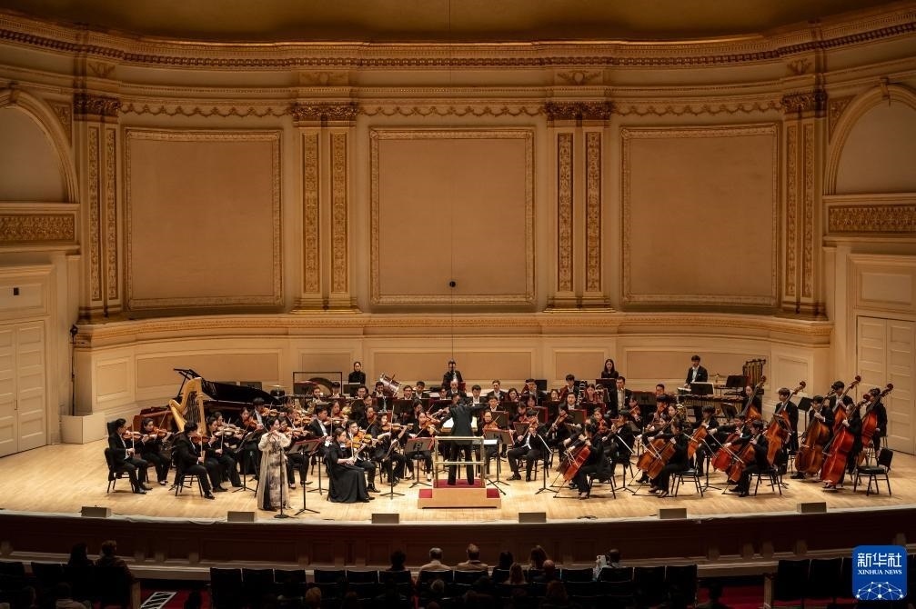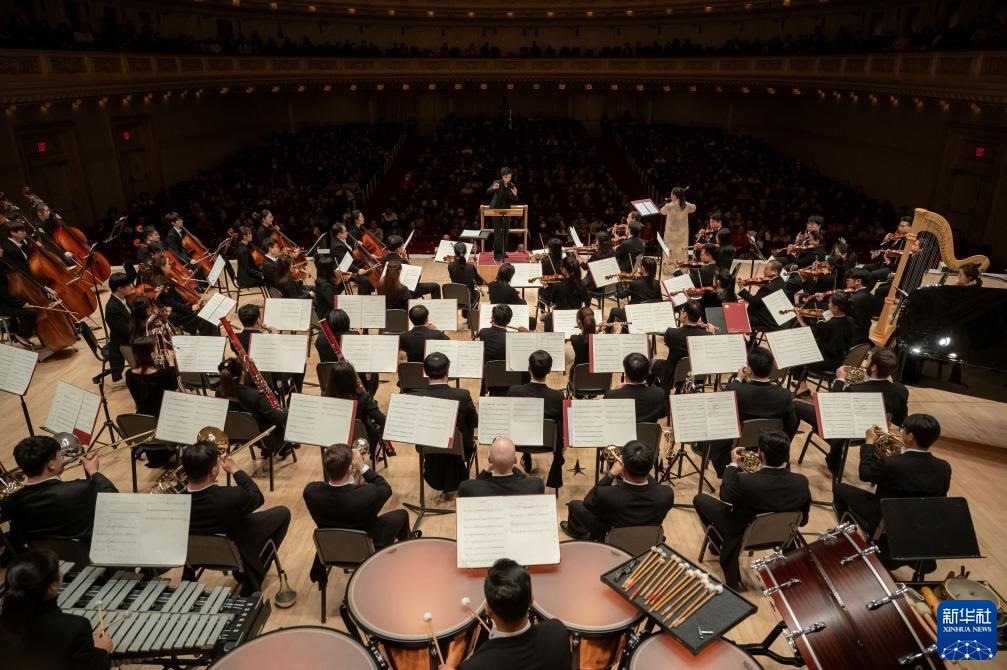 11月24日,來(lái)自中央音樂(lè)學(xué)院交響樂(lè)團(tuán)的藝術(shù)家在美國(guó)紐約卡內(nèi)基音樂(lè)廳進(jìn)行演出。新華社發(fā)(邁克爾·維奧拉果攝)