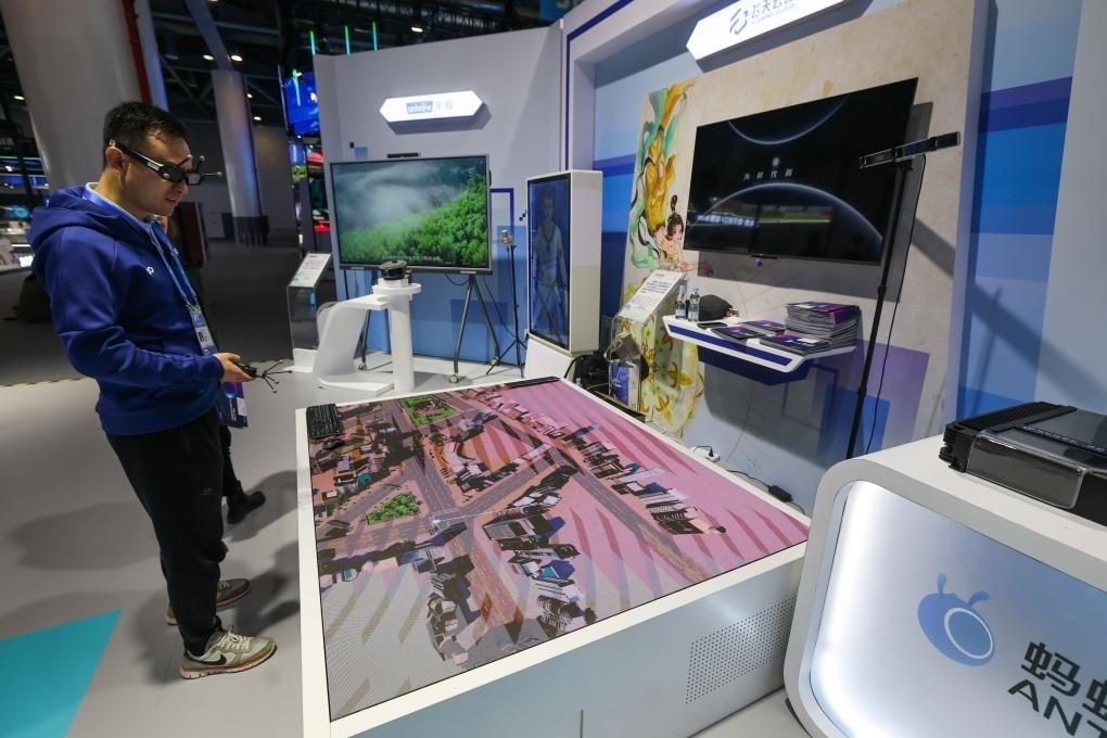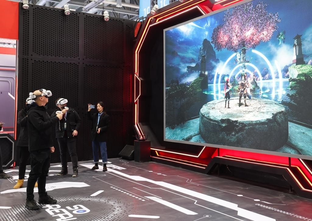 11月23日,在第二屆全球數(shù)字貿(mào)易博覽會上,參觀者戴上VR眼鏡體驗(yàn)虛擬游戲空間。新華社記者 徐昱 攝