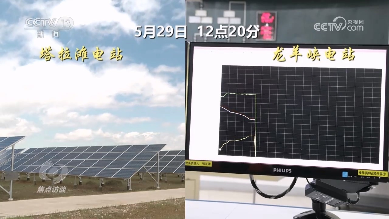 這一天,記者在龍羊峽水電站見到了水電光伏互補(bǔ)的實(shí)時(shí)情況。12點(diǎn)20分開始,50公里外塔拉灘光伏現(xiàn)場(chǎng)拍攝的影像顯示,有一大片云經(jīng)過光伏電站,光伏發(fā)電輸出立即發(fā)生了變化。這個(gè)數(shù)據(jù)變化實(shí)時(shí)傳到水電站的水光互補(bǔ)系統(tǒng)。