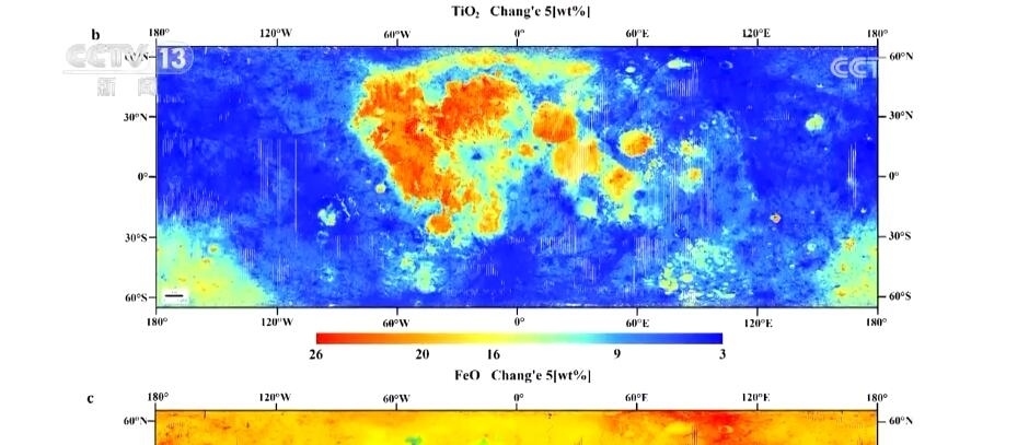吉林大學地球科學學院教授 楊晨:之前我們主要采用的月球表面元素成分圖,主要是基于美國和蘇聯(lián)的樣品數(shù)據(jù),主要反映的是月球30億年前的演變。我國采樣的嫦娥五號數(shù)據(jù),可以反映年輕的、20億年以來的月球歷史。我們基于嫦娥五號樣品數(shù)據(jù),獲得了月球表面六種主要元素在月球上的分布情況。其中,紅色部分代表元素含量相對較高,比如鈦和鐵。我們發(fā)現(xiàn)在月海附近(區(qū)域),它們的含量相對豐富,這兩種元素對于判定年輕月海玄武巖具有重要意義。