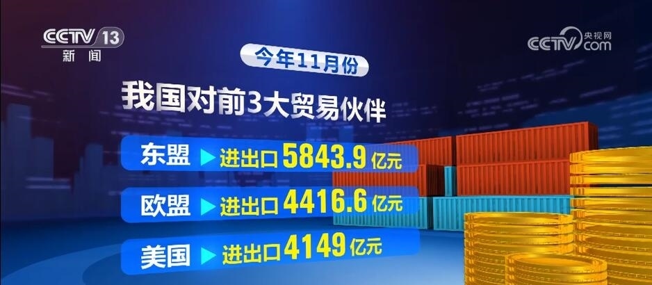 海關(guān)統(tǒng)計(jì)數(shù)據(jù)顯示,今年11月份,我國(guó)對(duì)前3大貿(mào)易伙伴東盟、歐盟、美國(guó)分別進(jìn)出口5843.9億元、4416.6億元、4149億元,合計(jì)占我國(guó)進(jìn)出口總值的38.9%;對(duì)共建“一帶一路”國(guó)家進(jìn)出口1.72萬(wàn)億元。同期,我國(guó)與拉美、非洲、中亞五國(guó)進(jìn)出口延續(xù)良好態(tài)勢(shì),分別增長(zhǎng)9.3%、8.4%、43%。