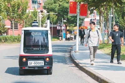 在浙江省金華職業(yè)技術(shù)學(xué)院的校園里,一輛無人快遞車在配送快遞。胡肖飛攝(人民圖片)