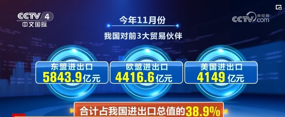 同時,對部分傳統(tǒng)市場貿(mào)易也出現(xiàn)積極變化。我國對前三大貿(mào)易伙伴東盟、歐盟、美國分別進出口5843.9億元、4416.6億元、4149億元,合計占我國進出口總值的38.9%。11月當月,中美貨物貿(mào)易同比增長2.7%,結束連續(xù)6個月的同比下降,環(huán)比增長4.3%。