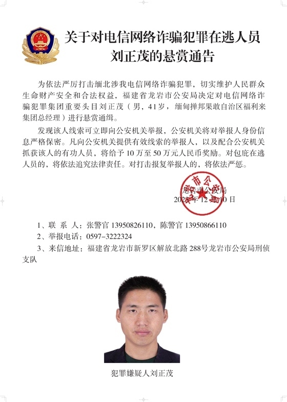 為依法嚴厲打擊緬北涉我電信網(wǎng)絡(luò)詐騙犯罪,切實維護人民群眾生命財產(chǎn)安全和合法權(quán)益,遼寧省大連市公安局決定對白所成、白應(yīng)蒼(又名李云晨)、白應(yīng)蘭(又名李夢娜)進行公開懸賞通緝;福建省泉州市公安局決定對魏懷仁、魏榕(又名陳榕)、魏青松(又名楊松)進行公開懸賞通緝;福建省龍巖市公安局決定對劉正祥、劉積光(又名李華光)、劉正茂進行公開懸賞通緝;重慶市公安局決定對徐老發(fā)(又名徐發(fā)啟)進行公開懸賞通緝。