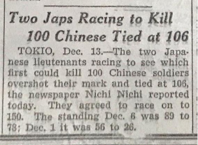 “根據(jù)《東京日日新聞》報(bào)道,兩名日本軍官比賽看誰(shuí)能先殺死100名中國(guó)士兵,結(jié)果都?xì)⒘顺^(guò)100人,雙方打平殺了106人,他們又同意重新比賽殺到150人為止,12月6日是89比78,12月1日是56比26。”這是1937年12月14日發(fā)行的《芝加哥每日論壇》中,一篇有關(guān)兩名日本軍官進(jìn)行“百人斬”殺人競(jìng)賽的報(bào)道節(jié)選。