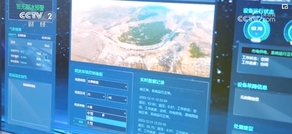 12月11日上午,記者看到肥城市交通部門工作人員,在監(jiān)控中心,遠程啟動了路面融冰融雪系統(tǒng)。在儀汶公路棋石嶺“S”形路段出,路邊噴頭噴灑環(huán)保型融雪劑快速融化路面的冰雪。