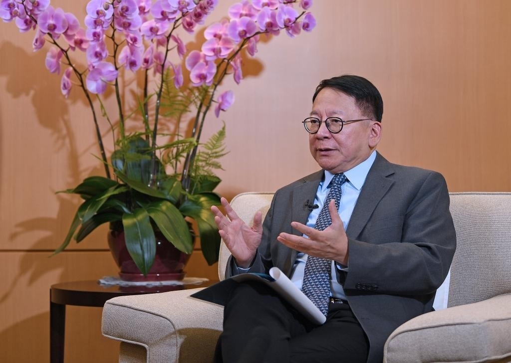 11月27日,香港特區(qū)政府政務(wù)司司長(zhǎng)陳國(guó)基接受采訪。新華社記者 陳鐸 攝