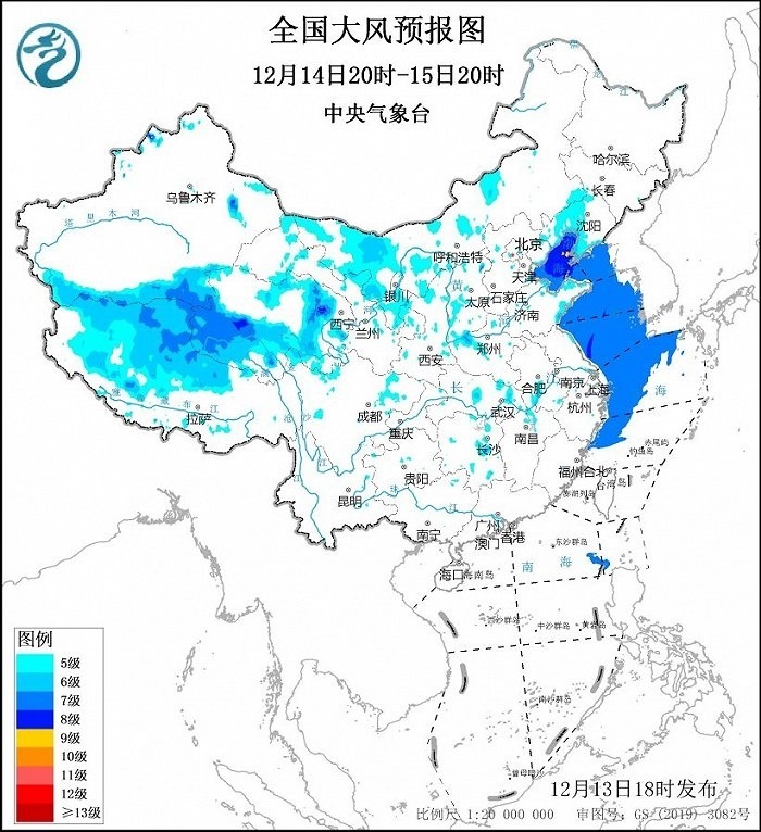 中央氣象臺12月13日18時發(fā)布大風藍色預警: