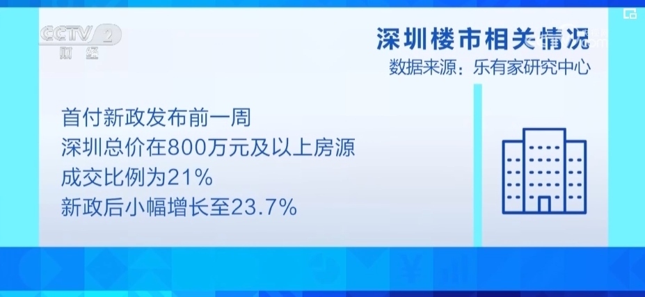 樂有家研究中心監(jiān)測數(shù)據(jù)顯示,首付新政發(fā)布前一周,深圳總價(jià)在800萬元及以上房源的成交比例為21%,新政后這一比例小幅增長至23.7%。