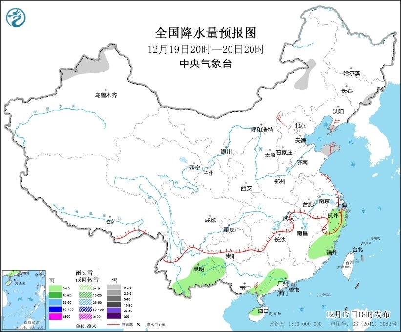 圖6 全國(guó)降水量預(yù)報(bào)圖(12月19日20時(shí)-20日20時(shí))