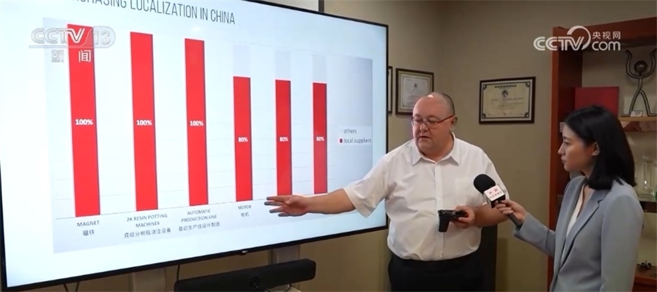 艾菲汽車零部件亞太區(qū)首席執(zhí)行官 埃里克·勒邁爾:從這張圖表中可以看出,就電機而言,我們使用的電機有80%來自當(dāng)?shù)毓?yīng)商,磁鐵則100%來自當(dāng)?shù)毓?yīng)商,當(dāng)?shù)毓?yīng)商質(zhì)量好、價格低。