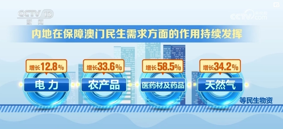 內(nèi)地對(duì)澳門出口商品結(jié)構(gòu)更加多元。2023年以來,內(nèi)地經(jīng)拱北海關(guān)對(duì)澳門地區(qū)出口機(jī)電產(chǎn)品74億元,占同期總值的37.4%,而1999年的比重不足10%。此外,電力、農(nóng)產(chǎn)品、醫(yī)藥材及藥品、天然氣等民生物資分別增長12.8%、33.6%、58.5%、34.2%,內(nèi)地在保障澳門民生需求方面的作用持續(xù)發(fā)揮。