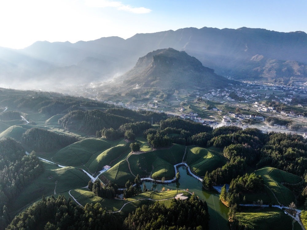 這是2023年12月5日拍攝的湖北省鶴峰縣走馬鎮(zhèn)楊柳池茶園風光(無人機照片)。新華社記者 楊文斌 攝